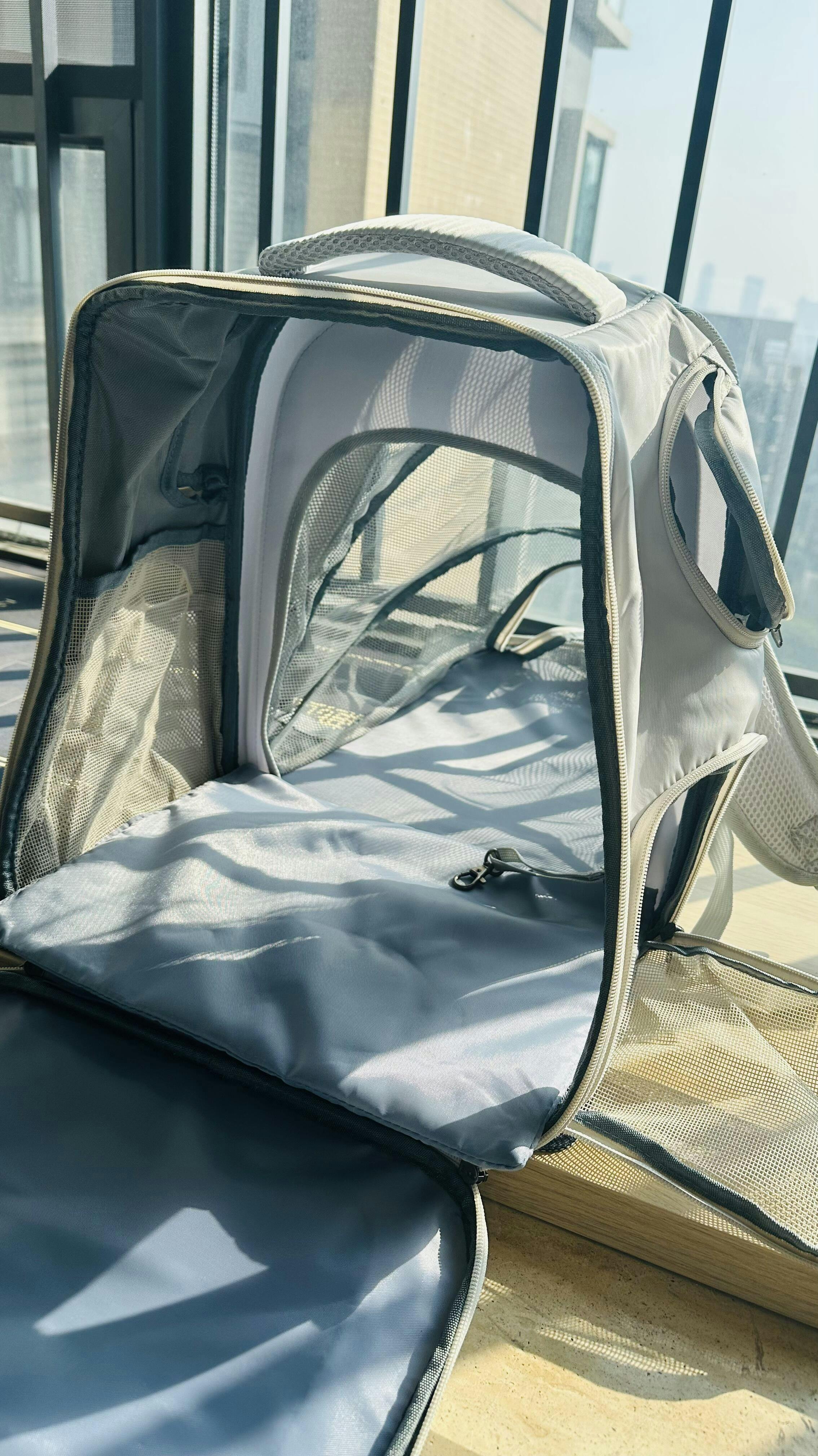 1.上部をワンタッチで展開できるテントで、ペットの活動スペースを広げます。猫とのインタラクション用の小窓があり、スチールワイヤーと通気メッシュで安定性と通風を確保します。